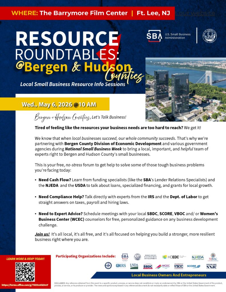 Celebrate National Small Business Week with the HCEDC, SBA, USDA, the Bergen County Division of Economic Development and other partners for the Resource Roundtable @ Bergen & Hudson Counties! Learn more about the resources available to support small businesses.